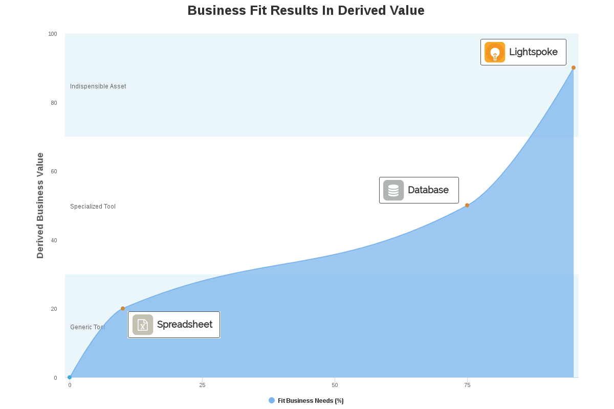 With triggers that enable customized business logic to be injected into each individual workspace, we consistently achieve 95% of the business' target functionality. We don't always need to hit the 95% mark at first because Lightspoke is flexible enough to grow organically. Applications are often put into testing at 90% with 5% of features in a holding pattern. After using the application, users almost always shift their thinking and come back with a different list of enhancements.